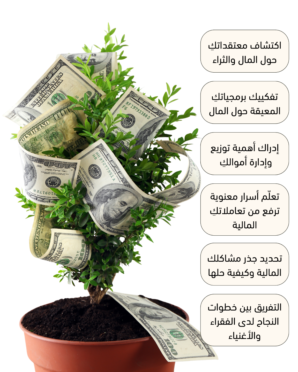- إدراكِ وبشكل واعي لطريقة تعاملكِ الحالية مع المال وكيف يمكنكِ التحسين منها لإدارة أموالك بشكل أفضل.